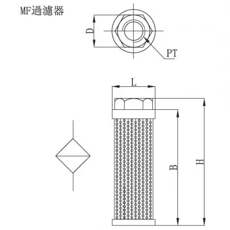 | Symbole / Type | PT | B mm | D mm | H mm | L mm | Maille de filtration | Débit l/min | Poids kg |